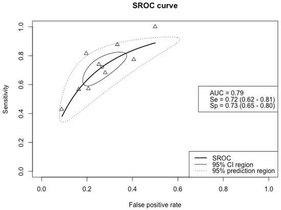 SROC curve of the diagnostic accuracy of Pro–C3 in detecting advanced fibrosis. The solid ellipse depicts the 95% confidence interval region of diagnostic accuracy data of Pro–C3 in the included studies; the dotted ellipse depicts the prediction region in which 95% of future diagnostic accuracy study estimates of Pro–C3 will fall. Triangles represent diagnostic accuracy estimates from each included study; circle represents the Youden Index threshold value. AUC = area under the receiver operating curve, Se = sensitivity, Sp = specificity.