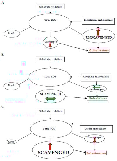 As shown in Figure 1, the redox status of each cell depends on an interplay between ROS generation through oxidation of different substrates; their use in various physiological processes that may be more or less demanding, depending on the type and physiological status of the cell in question; and the elimination of excess ROS by means of various scavenging mechanisms based on the action of antioxidants. When the supply of antioxidants is insufficient, the excess unscavenged fraction of ROS is causing oxidative stress (Figure 1A). An equilibrium between the antioxidant levels and the amount of excess ROS leads to an equilibrated redox balance, required for the optimal cell function (Figure 1B). If, on the contrary, the supply of antioxidants exceeds the needs for ROS scavenging, reductive stress results (Figure 1C). The adaptation of antioxidant treatments is to be aimed at the achievement of the equilibrated redox balance, avoiding both extreme conditions —oxidative and reductive stress (Figure 1).