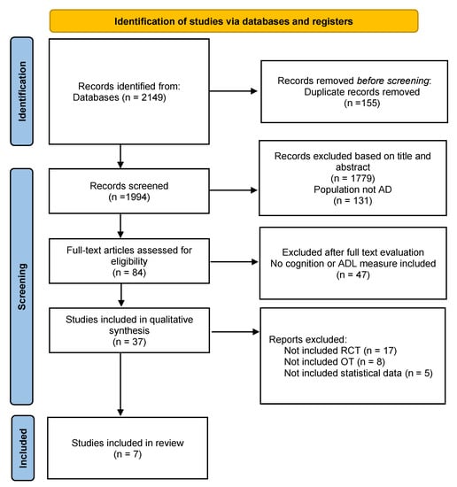 Based on the Preferred Reporting Items for Systematic reviews and Meta-Analysis (PRISMA) [25], we have diagrammed the step-by-step process of study selection in a flowchart (Figure 1) (This review was not registered in PRISMA). A total of 2149 studies were retrieved from the initial literature search, and 155 duplicate studies were excluded. Of the remaining 1994 studies, 1779 studies were excluded based on the inclusion/exclusion criteria by reviewing the titles and abstracts, and 131 studies were excluded because they did not include patients with AD. The full texts of the remaining 84 studies were inspected, and 47 studies were excluded because they did not assess cognition or ADL. Finally, studies that were non-RCTs that did not thoroughly describe the characteristics of OT, or that did not show means or SMD were excluded, and the remaining seven studies were selected for the final analysis.