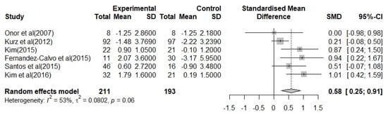 The effect size was calculated through the comparison of dependent variables between the test group and the control group of the seven RCTs studies selected, and the change in mean and SMD and the number of participants were used according to Cohen’s interpretation criteria [37]. In the interpretation of the overall effect size, ≤0.2 is considered a small effect, around 0.5 is considered a moderate effect, and ≥0.8, is considered a large effect [37]. The confidence interval (CI) was set at 95% of SMD.