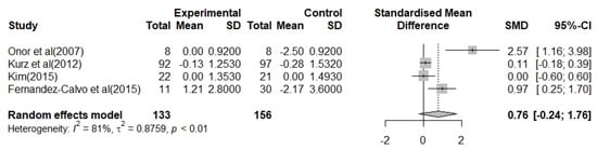 Four studies that reported 133 participants analyzed the effect on BADL in patients with AD. The heterogeneity for the overall effect size indicated I2 = 81% (p < 0.01), and a random-effects model was used. The effect size of multimodal OT program with cognition-oriented approach on BADL was moderate but not statistically significant, 0.76 (95% CI: −0.24–1.76). The effect size was positive in three of the four studies. However, one study did not show a positive effect. In total, compared to controls, the multimodal OT program with cognition-oriented approach group revealed a trend toward improving the impairment of BADL in patients with AD (Figure 4).