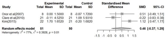Three studies that investigated 51 participants were available for IADL outcomes. The heterogeneity of the overall effect size was I2 = 81% (p < 0.01), and a random-effects model was used. The effect size of multimodal OT program with cognition-oriented approach on IADL was moderate but not statistically significant, 0.46 (95% CI: −0.37–1.29). The effect size was positive in two of the three studies. However, one study showed a negative effect. Collectively, compared to controls, the multimodal OT program with cognition-oriented approach group showed trends for maintenance, improvement, or degradation of IADL in patients with AD (Figure 5).