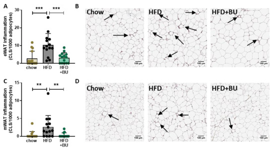 The observed increase in fat mass with HFD was accompanied by alterations in plasma adipokine concentrations, i.e., leptin was increased and adiponectin decreased. BU reduced plasma leptin concentrations with no effect on adiponectin (Table 1), suggesting a beneficial effect on adipose tissue. Quantitative histological analysis of inflammation in epidydimal and mesenteric white adipose tissue (WAT) depots demonstrated that the number of crown-like structures (CLS) was increased by HFD in both WAT depots (Figure 1A–D). BU lowered the number of CLS in both WAT depots, in line with the reduction in proinflammatory plasma leptin level.