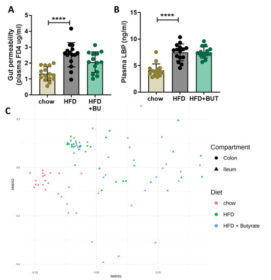 Butyrate does not affect gut permeability and microbiota composition. (A) Functional gut permeability fluorescein isothiocyanate-labeled dextran (FD4) assay. (B) Plasma LPS binding protein (LBP) concentrations. Data are presented as mean ± SD, **** p < 0.0001 vs. the HFD control group. (C) 16S rRNA gene analysis was performed to study the microbiota composition in fecal and mucosal compartments of both the colon and ileum. These changes in microbiota composition were visualized by non-metric multidimensional scaling (NMDS) using the Bray–Curtis index, in which every dot represents the microbiota composition of one mouse and the distance between dots represent how (dis)similar the microbiota composition is between these mice.
