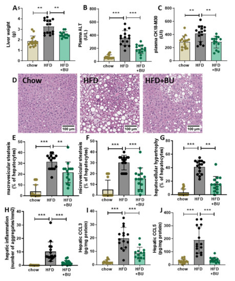 Liver weight was increased in control mice on an HFD, whereas BU-fed mice were protected from the HFD-induced liver weight gain (Figure 3A). Levels of the circulating liver damage markers ALT and CK18-M30 were increased with HFD and were lowered by BU (Figure 3B,C). To investigate the effect on the liver in more detail, liver cross sections were analyzed for histopathological features of NASH (Figure 3D). Steatosis was hardly present in the chow-fed mice, whereas HFD-fed mice developed pronounced steatosis with equal induction of macrovesicular (Figure 3E) and microvesicular steatosis (Figure 3F). BU significantly reduced steatosis observed by a similar reduction in both macrovesicular and microvesicular steatosis. Consistent with this, HFD increased the cross-sectional area covered with abnormally enlarged hepatocytes, which was attenuated with BU (Figure 3G). Hepatic inflammation was practically absent in chow-fed mice, and HFD strongly increased the number of inflammatory aggregates. BU significantly suppressed the number of inflammatory aggregates (Figure 3H). These anti-inflammatory effects were confirmed by analyzing hepatic chemokine concentrations. HFD increased hepatic CCL3 (MIP1a) and CCL5 (RANTES), which were significantly decreased with butyrate (Figure 3I,J). HFD feeding also significantly increased CXCL1 (KC) and CXCL10 (IP-10), which were not affected by butyrate (Supplementary Figure S4). Altogether, HFD feeding resulted in a pronounced increase in steatosis and inflammation in the liver, which was strongly attenuated by BU.