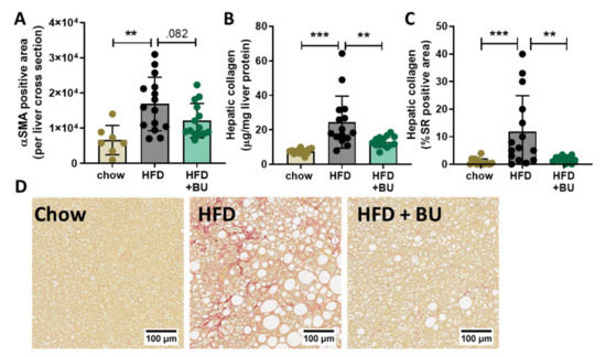Butyrate decreased liver fibrosis in 38-week HFD-fed animals. (A) Alpha-smooth muscle cell actin (αSMA) immunoreactive positive area in liver cross sections, (B) hepatic collagen content measured in liver homogenates, (C) Sirius-red (SR) positive area of (D) Sirius-red stained cross-sections (representative images). Data are presented as mean ± SD, ** p < 0.01, *** p < 0.001 vs. the HFD control group.