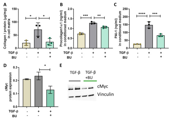 In conclusion, BU specifically and dose-dependently decreased collagen synthesis in TGF-β stimulated HSC by attenuating activation of HSC into proliferative fibrogenic myofibroblasts. Gene expression analysis indicated that BU deactivated non-canonical TGF-ß signaling pathways involving Rho-like GTPases and PI3K/AKT/MYC, confirmed by western blot analysis for cMyc protein expression, providing a rationale for its antifibrotic effects.