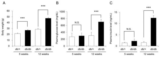 Body weight, blood glucose level, and blood insulin level. The body weight (A), blood glucose level (B), and blood insulin level (C) of db/+ mice and db/db mice at 5 and 12 weeks of age were measured (mean ± SD, n = 5, N.S.: not significant, ***: p < 0.001).