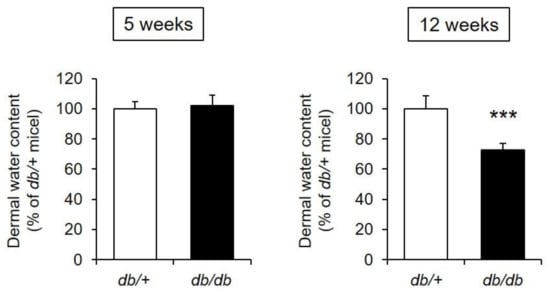 When the blood glucose and blood insulin levels of the db/db mice were measured, both were similar in 5-week-old db/db and control mice, whereas in 12-week-old mice, both the blood glucose level and blood insulin level were significantly increased in the db/db mice compared to the control mice. Therefore, the development of diabetes with insulin resistance was confirmed (Figure 1). The dermal water content of the db/db mice was almost the same as that of control mice at 5 weeks of age but significantly decreased at 12 weeks of age (Figure 2). From the above, dryness of the skin was observed in db/db mice that presented with the pathology of type 2 diabetes, and this phenomenon was similar to clinical reports that diabetic patients develop xeroderma [3,4].