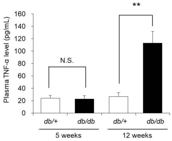 The blood TNF-α concentration in 5-week-old db/db mice was almost the same as that in 5-week-old control mice. In contrast, the blood TNF-α concentration in 12-week-old db/db mice was approximately 4-fold higher than that in the 12-week-old control mice (Figure 6).