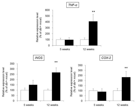 The mRNA expression level of TNF-α in the skin of 5-week-old db/db mice was almost the same as that of 5-week-old control mice. In contrast, the expression level of TNF-α was significantly higher (increased by approximately 4-fold) in 12-week-old db/db mice than in 12-week-old control mice. Similarly, the expression levels of iNOS and COX-2 were no different in the 5-week-old db/db and control mice, whereas these levels were significantly higher in 12-week-old db/db mice compared to 12-week-old control mice (Figure 7).