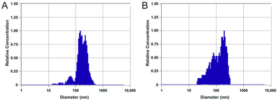 Nanoparticle tracking analysis (NTA) characterization showing size distributions of isolated microvesicles (MVs) from (A) MCF10A and (B) MDA-MB-231 cell lines.