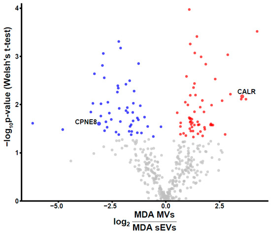 The fold changes of the abundance of proteins common to small different extracellular vesicles (sEVs) and MVs derived from the MDA-MB-231 cell line are depicted in the volcano plot. Proteins with a p-value below 0.05 were colored according to higher abundance in sEV (blue) and MVs (red) fractions. p-Values were calculated using Welsh’s t-test.