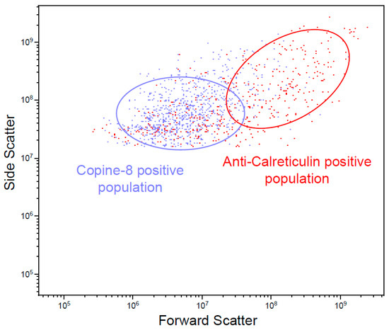 Vesicle-enriched media was cleared from cell debris and large vesicles by centrifugation at 300× g for 10 min, 3000× g for 20 min, followed by 15,000× g for 20 min. The cell culture media was diluted with PBS in a 1:4 ratio to avoid the swarm effect. Copine-8 (Cat No. ITT1060, G-Biosciences, St. Louis, MO, USA) conjugated with Alexa 647, and Anti-Calreticulin antibody (Cat No. EPR3924, Abcam, Boston, MA, USA) conjugated to PE, were titrated to find the optimal antibody concentration 1/100,000 and 1/10,000, respectively. The diluted supernatant was incubated with the antibodies for 1 h at 140 rpm at room temperature. The complete growth media was filtered using a Steri-flip vacuum system (Cat No. C238, Sigma-Aldrich, Oakville, ON, Canada) and stained by the antibodies as the baseline control for fluorescence. The samples were analyzed using the Beckman Coulter MoFlo Astrios-EQ Cell Sorter obtaining 100,000 events, and the data were processed using Kaluza software (version 2.1, Beckman Coulter, Mississauga, ON, Canada). The gating procedure included doublet discrimination based on forward scatter, followed by reduction of background signal from antibody in vesicle depleted media. For confirmation of vesicle analysis, samples were incubated in 0.1% Triton X-100 for 20 min at room temperature prior to flow cytometry (FC).