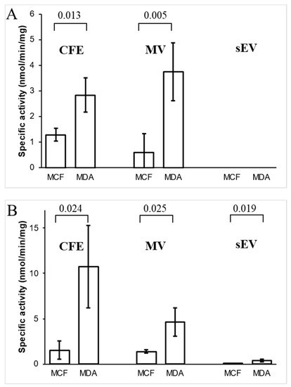 In this study, the proteomes of the metastatic BC cell line MDA-MB-231-derived MVs were compared to the non-cancerous cell line MCF10A-derived MVs. Differences were identified in the MV proteins when compared to the previously profiled sEV proteome derived from the same metastatic BC cell line MDA-MB-231 [30]. There are significant differences in the proteomes of BC-derived exosomes and MVs. Three enzymes unique to MDA-MB-231 were validated in cells, sEVs, and MVs.