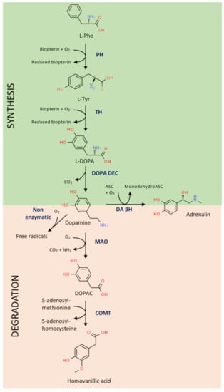 The enzymes involved in the production and the degradation of DA (Figure 1) are very important in maintaining appropriate catecholamine levels and homeostatic conditions. Drugs that alter the activity of COMT, monoamine oxidase (MAO) or dopamine β-hydroxylase, may affect dopaminergic neurotransmission and any other DA-mediated physiological effects. However, the inhibition of COMT or MAO-B at adequate dosages may be beneficial for neuroprotection in PD [72,73]. The imbalance of systems that depend on DA may also occur following alterations in the expression of those enzymes, or polymorphisms in their respective genes [74,75].