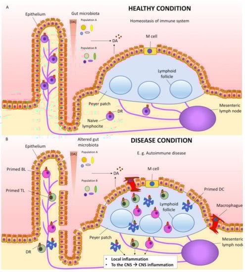 Dopamine link between gut and inflammation in the periphery and in the CNS. Cells in the intestine and also gut microbiota cells produce DA, which on one hand influences the composition of the gut microbiota and on the other hand binds to the dopamine receptors located in the surrounding cells, including immune cells. (A) In healthy conditions, there is homeostasis of the gut immune system. (B) In diseases affecting the gut, e.g., autoimmune diseases such as inflammatory bowel disease, immune cells (DCs, TLs, BLs, etc.) get primed. Macrophages infiltrate from the intestinal lumen trough the damaged epithelium. These primed immune cells produce local inflammation, but also reach the blood and may permeate the blood–brain barrier, reaching the brain and boosting CNS inflammation. BL, B lymphocyte; DC, dendritic cell; DA, dopamine; DR, dopamine receptor; TL, T lymphocyte.