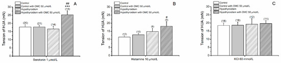 Tension (mN) (at time 15 min) of the human umbilical artery (HUA) rings without (control) and with hypothyroidism incubated with octylmethoxycinnamate (OMC, 0 and 50 μmol/L) and contracted by (A) serotonin (5-HT; 1 μmol/L), (B) histamine (His; 10 μmol/L) and (C) potassium chloride (KCl; 60 mmol/L). Each bar represents the mean, vertical lines the S.E.M. and the number within brackets the n. Asterisk * represents a significant difference versus incubation: *** p < 0.001, and hashtag # represents a significant difference versus hypothyroidism: # p < 0.05 and ## p < 0.01; two-way ANOVA method followed by Holm–Sidak post-hoc tests.