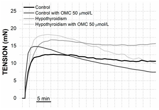 Direct application of different concentrations of OMC (0.001–50 μmol/L) on the control group (pregnant without pathology) and in the hypothyroidism group (pregnant with hypothyroidism) did not change their basal tension. Moreover, the incubation of 50 µmol/L of OMC did not change their basal tension. The solvent used (ethanol 0.05%) in control and hypothyroidism groups did not have an effect on the basal tension (data not shown).