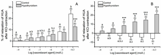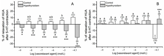 Percentage of relaxation of human umbilical artery (HUA) rings without (control) and with hypothyroidism incubated with (A) 0 μmol/L and (B) 50 μmol/L of octylmethoxycinnamate (OMC) and contracted by serotonin (5-HT; 1 μmol/L). Each bar represents the mean, vertical lines the S.E.M. and the number within brackets the n. Asterisk * represents a significant difference versus hypothyroidism: * p < 0.05 and *** p < 0.001, and the different letters represents significant differences between OMC concentrations (p < 0.05); two-way ANOVA method followed by Holm–Sidak post-hoc tests.