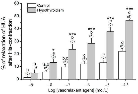 Percentage of relaxation of human umbilical artery (HUA) rings without (control) and with hypothyroidism non-incubated with octylmethoxycinnamate (OMC, 0 μmol/L) and contracted by histamine (His; 10 μmol/L). Each bar represents the mean, vertical lines the S.E.M. and the number within brackets the n. Asterisk * represents a significant difference versus hypothyroidism: * p < 0.05 and *** p < 0.001, and the different letters represents significant differences between OMC concentrations (p < 0.05); two-way ANOVA method followed by Holm–Sidak post-hoc tests.