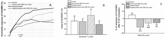 Effects of OMC on the human umbilical artery smooth muscle cells (HUASMCs) without (control) and with hypothyroidism incubated with octylmethoxycinnamate (OMC, 0 and 50 μmol/L) and contracted by serotonin (5-HT; 1 μmol/L). (A) Contractile response of HUASMC (%) during 40 min; (B) area (%) (at time 20 min) of the HUASMC and (C) percentage of relaxation of HUASMC after 5-HT contraction. Each bar represents the mean, vertical lines the S.E.M. and the number within brackets the n. Asterisk * represents a significant difference versus incubation: *** p < 0.001, and Hashtag # represents a significant difference versus hypothyroidism: ## p < 0.01 and ### p < 0.001; two-way ANOVA method followed by Holm–Sidak post-hoc tests.