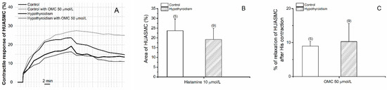 The effects of OMC on cells contracted with His are present in Figure 7. The contraction with His produced stables contractions only in HUASMC from control groups (Figure 7A). The results show that OMC in the short-term produced a vasorelaxation effect in the hypothyroidism group similarly to the control group (Figure 7C).