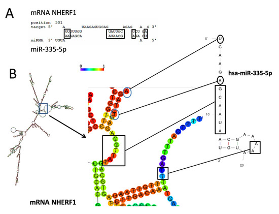 Computer-aided analysis of the possible pairing interaction between hsa-miR-335-5p (entry: http://www.mirbase.org/cgi-bin/mirna_entry.pl?acc=MI0000816) and NHERF1 mRNA (entry: https://www.ncbi.nlm.nih.gov/nuccore/381214354). The RNAhybrid tool for the prediction of miRNA and mRNA interaction (https://bibiserv2.cebitec.uni-bielefeld.de/rnahybrid) [47], the UNAfold web server (http://unafold.rna.albany.edu/), and the RNAfold WebServer (http://rna.tbi.univie.ac.at/cgi-bin/RNAWebSuite/RNAfold.cgi) were used. (A) Complementarity between miR-335-5p and NHERF1 mRNA miR-335 site; (B) magnification of the stem-loop secondary structure indicating possible interactions. Colors in the schematic structure refer to probability of base pairing or unpairing (remaining as single base). Red segments contain the paired (or unpaired) bases of the highest probability.