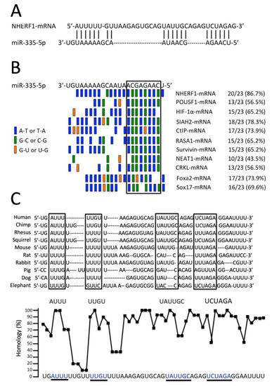 The possibility that the miR-335-5p binding sequence of NHERF1 is highly conserved through evolution would suggest a role of miR-335-5p in NHERF1 expression and functions. In Figure 2C, the alignment is shown of the miR-335-5p binding sites of Homo sapiens (Human), Pan troglodytes (Chimp), Macaca Mulatta (Rhesus), Saimiri sciureus (Squirrel), Mus musculus (Mouse), Rattus norvegicus (Rat), Oryctolagus cuniculus (Rabbit), Sus scrofa (Pig), Bos taurus (Cow), Felis catus (Cat), Canis lupus familiaris (Dog), Myotis lucifugus (Brown bat) and Loxodonta africana (Elephant). This analysis underlines differences with respect to the Homo sapiens sequence. The NHERF1 sequences complementary to miR-335-5p (see Figure 2A) are boxed. These regions show the highest level of homology (reaching 100% homology in some positions), as indicated in the bottom part of Figure 2C, where these regions are underlined, and the analysis of the homology is shown for each nucleotide. Taken together, the data shown in Figure 2 sustain the concept of a role of miR-335-5p binding sites in NHERF1 gene regulation.