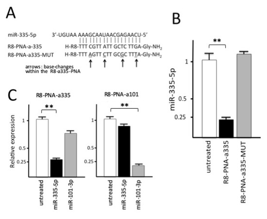 (A) Sequences of the R8-PNA-a335 and of the mutated R8-PNA-a335-MUT. The mutations in the R8-PNA-a335-MUT are underlined and arrowed. (B) Inhibition of miR-335-5p hybridization signals in Calu-3 cells treated for 72 h with R8-PNA-a335 (black box) and mutated R8-PNA-a335-MUT (gray box) molecules (4 µM); white boxes: untreated Calu-3 cells. (C) Effects of treatments of Calu-3 cells with R8-PNA-a335 and R8-PNA-a101 on miR-335-5p (black boxes) and miR-101-3p (gray boxes) hybridization signals. Treatments were carried out for 72 h with 4 µM R8-PNA-a335 and R8-PNA-a101. Results are expressed as mean ± standard error of the mean (SEM) of at least three independent experiments. ** Statistical significance at p < 0.01.