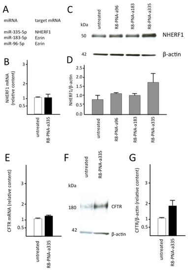 (A) The studied microRNAs and relative mRNA targets. Changes in NHERF1 (B–D) and CFTR (E–G) gene expression analyzed by RT-qPCR (B,E) and Western blotting (C,D,F,G) in samples from Calu-3 cells cultured for 72 h in the absence or in the presence of R8-PNA-a335-5p, as indicated. The mRNA regulated by the targeted miRNAs are outlined in panel A. Results are expressed as mean ± standard error of the mean (SEM) of at least three independent experiments. Changes in the content of NHERF1 (C,D) and CFTR (F,G) relative to ß-actin (C,D,F,G) are indicated.