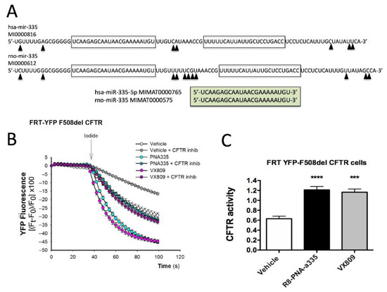 In order to evaluate whether R8-PNA-a335 rescues the F508del CFTR function, Cl- transport was studied in FRT cells co-expressing human F508del CFTR and yellow fluorescent protein (YFP H148Q/I152L). In this experimental cellular system, the high CFTR expression is dependent on a correction of the mutated F508del CFTR transcript encoded by the recombinant construct employed [40,41]. Firstly, we verified by RT-ddPCR that miR-335-5p is produced by FRT cells (Supplementary Figure S5) and that a 100% homology (and therefore ability to be targeted by the R8-PNA-a335) does exist between human and rat miR-335-5p (Figure 5A). Then, FRT cells were treated for 48 h with or without 4 μM R8-PNA-a335 or VX 809 (Lumacaftor) (5 μM) and CFTR-dependent Cl- transport measured by single cell digital imaging (Figure 5B,C). As shown in Figure 5B,C, we found that R8-PNA-a335 rescued CFTR-dependent Cl- transport. Interestingly, this effect was remarkable, since this miR-335 dependent rescue was obtained with an efficiency similar to that of VX 809. Since the PNA-a335 mediated rescue of the CFTR biological activity in this system cannot be simply caused by an increase in mutated CFTR, we hypothesize that this rescue of CFTR activity is associated with the up-regulation of NHERF1, which is known to be able to cause the rescue of the deltaF508CFTR functional expression [18,64,65].