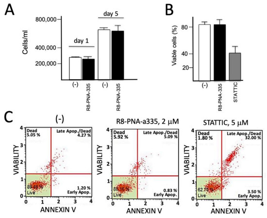 The results shown in Figure 6 were obtained in order to verify whether R8-PNA-a335 was to some extent cytotoxic. The results obtained demonstrate that the PNA tested did not exhibit antiproliferative effects (panel A), did not reduce the extent of viable cells (panel B), and did not induce apoptosis when compared to the proapoptotic compound Stattic (Selective STAT3 inhibitor, panel C). In these experiments, Calu-3 cells were cultured for 72 h in the absence, in the presence of R8-PNA-a335 or with the apoptotic inducers Stattic (5 μM) combined to 10% DMSO. After this treatment, the cell number/mL was determined, the dead cells were measured, and the possible induction of apoptosis was detected. The Annexin V and Dead Cell assays were performed with the Muse Cell Analyzer (Merck Millipore) method. The results obtained are shown in Figure 4C and demonstrate that apoptosis was not induced by PNAs targeting miR-335-5p, whereas under the same conditions, an increase in apoptosis was observed using Stattic with 10% DMSO.