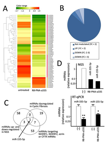Effects of R8-PNA-a335 on miRNome profile analyzed by NGS sequencing. (A) Calu-3 cells were cultured in the absence or in the presence of R8-PNA-a335 for 48 h, RNA was extracted and NGS performed as described in the Materials and Methods section. (B) Summary of the number of miRNAs not modulated, or up- (FC > 2) and down- (FC: 2–3; FC > 3) modulated. (C) Venn diagram showing miR-155-5p as the only miRNA in common with the three lists (miRNAs up- and down-regulated in NGS, miRNAs dysregulated in CF and miRNA targeting NHERF1, NHERF2, Ezrin or CFTR mRNAs). (D) Validation of the R8-PNA-a335 mediated down-regulation of miR-155-5p by RT-qPCR. Data were derived by three independent experiments. Statistical comparisons were made using a nonparametric ANOVA test (* p < 0.05, ** p < 0.01).