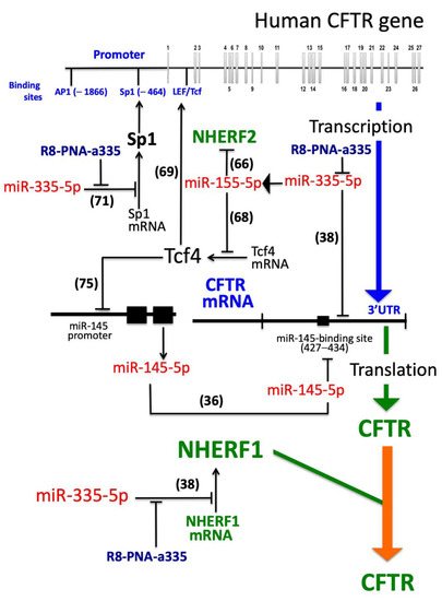 Proposed model for the interplay between transcription factors, NHERF1, CFTR regulation and miR-335-5p regulated molecules. The published information concerning specific steps are indicated in parenthesis. The effects of R8-PNA-a335 on miR-335-5p are presented in Figure 3. The effects of R8-PNA-a335 on miR-155-5p are described in Figure 7. The effects of R8-PNA-a335 on NHERF1 and CFTR are presented in Figure 4. MicroRNAs and PNAs are in red- and blue-marked, respectively. The colored arrows represent transcription (blue), translation (green) and processing (orange).
