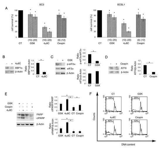 Previous studies have shown that PEL cells display a basal UPR activation [6], as they are secretory B cells characterized by a high level of ER stress. Therefore, we first inhibited IRE1alpha endoribonuclease activity by using 4μ8C. We found that it induced a dose-dependent cell death in both BC3 and BCBL1 PEL cells (Figure 1A). Differently from 4u8c, the inhibition of PERK by GSK2606414 or of ATF6 by Ceapin slightly reduced PEL cell survival (Figure 1A). We then evaluated whether these inhibitors at the doses used to treat PEL cells could effectively reduce the activation of the three UPR sensors. Therefore, we evaluated by Western blot analysis the spliced form of XBP1 (XBP1s), target of IRE1alpha endoribonuclease activity, the phosphorylation of eIF2alpha, target of PERK and the cleaved form ATF6, whose formation is inhibited by Ceapin, as it antagonizes ATF6 transport to the Golgi apparatus [16]. As shown in Figure 1B–D, the expression level of XBP1s and the cleaved form of ATF6 as well as the phosphorylation of eIF2alpha were reduced by using the UPR specific inhibitors, used at the highest dose. To explore whether the impairment of cell survival occurring following UPR inhibition, particularly following 4μ8C treatment, could be due to apoptosis induction, we evaluated the cleavage of PARP1, as it can be mediated by caspase activation [17]. As shown in Figure 1E, the PARP1 cleaved form increased in PEL cells treated by 4μ8C, while it slightly increased following treatment with GSK2606414 or Ceapin. Apoptosis induction was confirmed by the increase in subG1 events that was particularly evident in 4μ8C-treated PEL cells (Figure 1F).