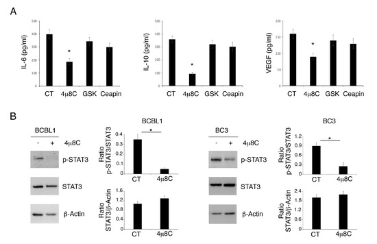 Searching for the molecular mechanism/s that could lead to higher cell death induction by 4μ8C, we assessed the release of cytokines IL-6, IL-10 and VEGF, known to sustain PEL cell survival following treatment with 4μ8C or GSK2606414 or Ceapin. The results shown in Figure 2A indicate that only 4μ8C strongly reduced the production of these cytokines, which was slightly downregulated by GSK2606414 or Ceapin. These cytokines may lead to the activation of STAT3, a pathway whose constitutive phosphorylation plays a pro-survival role in PEL. We found that STAT3 705 tyrosine phosphorylation (Tyr705) was reduced by 4μ8C (Figure 2B), according to its mediated impairment of cytokine release. All together, these results suggest that the reduction in cytokine production and STAT3 de-phosphorylation could underlie the impairment of PEL cell survival mediated by 4μ8C.