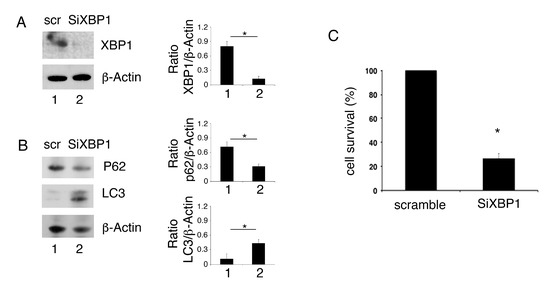The role of XBP1 inhibition in autophagy and survival of PEL cells was then evaluated by silencing it by specific siRNA. We found that XBP1 knock-down (Figure 4A) reduced p62/SQSTM1 expression level in comparison with scramble-treatment, suggesting autophagy activation by XBP1 silencing (Figure 4B). Moreover, similarly to what was observed by using 4μ8C, XBP1 silencing increased LC3II expression level (Figure 4B) and reduced PEL cell survival (Figure 4C).