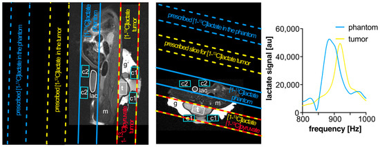 Images and spectra were acquired using a small animal 7 T preclinical scanner (Agilent Discovery MR901 magnet and gradient system, Bruker AVANCE III HD electronics) with a dual-tuned 1H/13C volume resonator (inner diameter 72 mm, RAPID Biomedical) for proton anatomical imaging, shimming, and frequency calibration, and for 13C excitation. Surface receiver coils (20 mm diameter, RAPID Biomedical) were placed on top of the tumors and near a thermally-polarized [1-13C]lactate phantom [28] (for pre-scan adjustments) for 13C signal reception. The signals from the two receiver coil channels were processed separately for the area adjacent to the coils. Carbopol® 980 gel (Caesar & Loretz GmbH, Germany) surrounded the tumor for improved B0 shim uniformity (Figure 1).