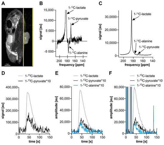 Slice spectroscopy with hyperpolarized [1-13C]pyruvate has a wide range of applications, such as tumor characterization and therapy response monitoring in subcutaneously implanted rodent tumor models, including patient-derived xenografts [14,16]. It has also been interleaved with imaging excitations [4,15] and used to localize signal in the ipsilateral side of a brain implanted with a tumor [39] or acute myocardial ischemia [40]. In contrast, spectroscopy of hyperpolarized [1-13C]lactate and its metabolites has been less well studied. Long polarization times and low levels of downstream metabolites are the biggest limitations of [1-13C]lactate imaging; the pyruvate pool size is small and the label exchange from lactate to pyruvate is rather slow [30].