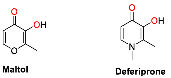 Chemical structures of maltol and deferiprone as representative examples of hydroxypyr(id)ones, and their chelating atoms highlighted in red.