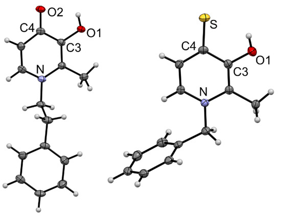 Single crystals of 1b and 1d were obtained by slow evaporation of a MeOH/dichloromethane solution (Figure 2). When comparing the bond lengths, as expected, the C4=O bond in 1b was significantly shorter than the equivalent C4=S bond in 1d (Table S2), as well as of the C3–O1 bonds with single-bond character. The C3–O1 bonds were minimally influenced by the substitution of the O=C4 for S=C4 and virtually identical bond lengths were detected. As expected, the atoms O2/S–C4–C3–O2 formed a plane, with the bonds from C3 to the adjacent carbon atoms having single- (C3–C4) and double-bond character (C2–C3). In both 1b and 1d, π stacking between the pyridone rings was observed (Figures S1 and S2). In the case of 1b, in addition, a H bond network was seen involving both the OH and O=C4 groups as well as co-crystallized MeOH (Figure S1).