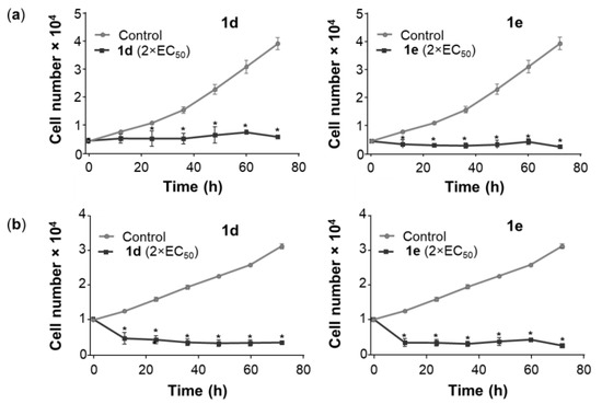 Time course cytotoxicity assessment of 1d and 1e in A549 and NCI-H522 cells. A549 cells and NCI-H522 were seeded in 96-well plates at 4000 and 10,000 cells per well, respectively, and incubated for 24 h at 37 °C. (a) A549 cells were treated with 0.72 µM of 1d and 0.64 µM of 1e, while (b) NCI-H522 cells were treated with 0.56 µM of 1d and 0.46 µM of 1e, in both cases for 12–72 h. Vehicle control cells were treated with DMSO (0.5%). At the end of the treatment period, the cell number was determined by the SRB assay. The points represent the mean ± SEM (n = 3). Data were analyzed using a two-way ANOVA coupled with a Bonferroni post hoc test. * Significantly different from control, p < 0.01. No significant differences were determined between each treatment point from 12 to 72 h.
