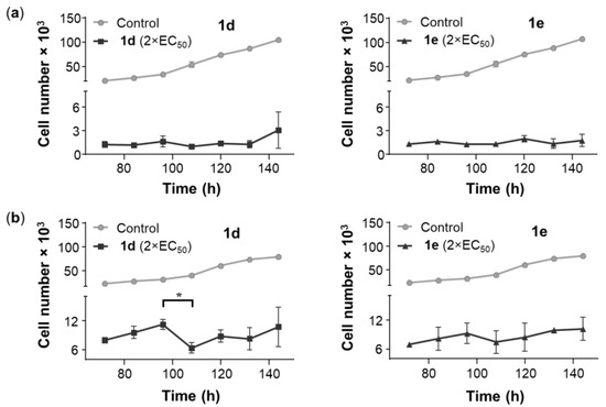 The majority of NSCLCs are incurable due to drug resistance, which leads to aggressive tumor variants [56,57]. To investigate the drug withdrawal effect of 1d and 1e, A549 and NCI-H522 cells were treated with 1d and 1e for 72 h and then cultured in the absence of drug for an additional 72 h. The number of viable A549 and NCI-H522 cells decreased significantly after 72-h exposure of either 1d or 1e but no significant changes in cell number were observed after drug withdrawal (Figure 4), suggesting that neither A549 nor NCI-H522 cells reverted to their typical growth pattern. Interestingly, the A549 cells did not regrow upon withdrawal of 1d and 1e despite the compounds being cytostatic (Figure 3a).