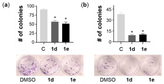 The effect of the withdrawal of 1d and 1e on the colony-formation ability of A549 and NCI-H522 cells. (a) A549 cells were treated with 0.72 µM of 1d and 0.64 µM of 1e, while (b) NCI-H522 cells were treated with 0.56 µM of 1d and 0.46 µM of 1e, each for 72 h. Vehicle control cells were treated with DMSO (0.5%). The A549 and NCI-H522 (2 × 102 and 5 × 102 cells, respectively) cells were then seeded in 6-well plates for 14 and 21 days, respectively, and the medium was changed every three days. Single-colony formation was determined by crystal violet staining. Bars represent the mean ± SEM (n = 3). Data were analyzed with a one-way ANOVA coupled with a Bonferroni post hoc test. * Indicates significant differences to control, p < 0.01.