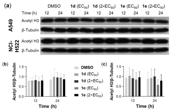 A549 (1.0 × 106 cells per dish) and NCI-H522 cells (2.5 × 106 cells per dish) were seeded in 10-cm cell culture dishes and incubated for 24 h. The cells were then treated with 1d or 1e at 1× and 2× the EC50 value or DMSO (0.5%) for 12 and 24 h. The cells were then lysed with lysis buffer (50 mM Tris base (pH 7.5), 150 mM NaCl, 1 mM EDTA, 1 mM EGTA, 0.5% NP-40, 0.5% SDS, 1 mM sodium orthovanadate, 2.5 mM sodium pyrophosphate, 10 mM sodium fluoride, 1 mM PMSF, and complete protease and phosphatase inhibitor cocktail). Cell lysates were then collected, sonicated, and centrifuged at 14,000 rpm for 8 min at 4 °C. Cell lysates were then boiled in Laemmli buffer and resolved by SDS-PAGE (25 µg/lane for A549 cells and 20 µg/lane for NCI-H522 cells) and were then transferred to a polyvinylidene fluoride (PVDF) membrane (Bio-Rad Laboratories, Hercules, CA, USA). Protein levels were analyzed with either acetylated histone-H3, cyclin D1 or cyclin B1, primary antibodies (Cell Signaling Technology, Danvers, MA, USA) followed by horseradish peroxide-conjugated secondary antibodies (Merck Millipore, Burlington, MA, USA). The film was scanned using a GS710 densitometer (Bio-Rad Laboratories). The protein density was calculated as a percentage of β-actin or β-tubulin (Cell Signaling Technology, Danvers, MA, USA). The results presented are from three independent experiments performed in triplicate.