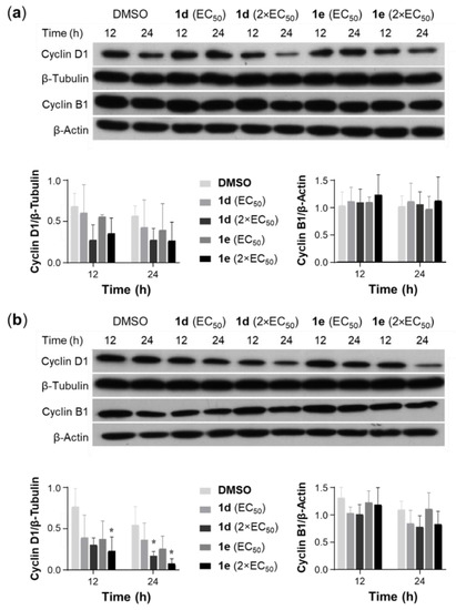Effect of 1d and 1e on the expression of cyclin D1 and B1 in A549 and NCI-H522 cells. Cell lysates of (a) A549 and (b) NCI-H522 cells, which were treated with 1d and 1e at 1× and 2× the EC50 concentrations for 12 and 24 h, were subjected to Western blotting with specific antibodies for cyclin D1 and B1. Vehicle control cells were incubated with DMSO (0.5%). Blots shown are representative of n = 3. Scanning densitometry of the ratio of cyclin D1 to β-tubulin and cyclin B1 to β-actin in A549 (a) and NCI-H522 (b) cells. Bars represent mean ± SEM (n = 3). Data were analyzed with a two-way ANOVA coupled with a Bonferroni post hoc test. * Indicates significant differences relative to control (p < 0.01).