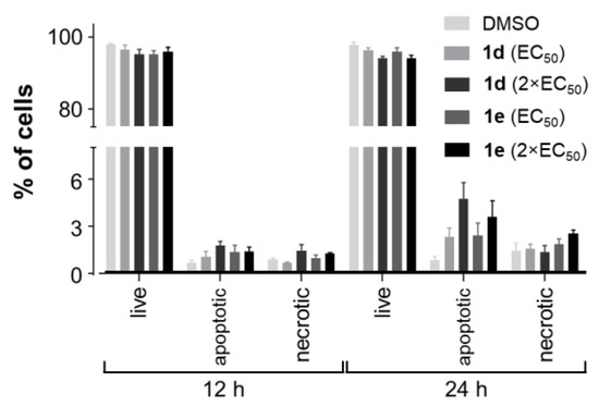 Proportion of apoptotic and necrotic NCI-H522 cells following treatment with 1d and 1e. NCI-H522 (3.0 × 105 cells per well) cells were seeded in 6-well plates. NCI-H522 cells were treated with 1× and 2× the EC50 of 1d and 1e for 12 and 24 h. Vehicle control cells were treated with DMSO (0.5%). Bars indicate the mean number of cells (% of total) ± SEM (n = 3). Data were analyzed with a two-way ANOVA coupled with a Bonferroni post hoc test. None were significantly different.