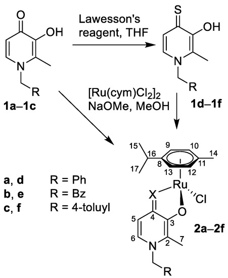 The dimeric precursor bis[dichlorido(η6-p-cymene)ruthenium(II)] [45], 1-benzyl-2-methyl-3-hydroxypyridin-4(1H)-one (1a) [33,35], 1-ethylbenzyl-2-methyl-3-hydroxypyridin-4(1H)-one (1b) [44], and 1-(4-methylbenzyl)-2-methyl-3-hydroxypyridin-4(1H)-one (1c) [44] were prepared according to literature procedures. 1-Benzyl-2-methyl-3-hydroxypyridin-4(1H)-thione (1d) [33,35] and 1-ethylbenzyl-2-methyl-3-hydroxypyridin-4(1H)-thione (1e) [33] were reported earlier, however, using different procedures.