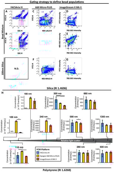 Although LoD and LoQ are useful to define the smallest particles that can be detected and discriminated from the background and quantified with satisfactory accuracy, respectively, they do not convey the ability of a cytometer to detect particles of different sizes. Therefore, we compared the concentrations of the different nanospheres between platforms in order to address this problem (Figure 2H).